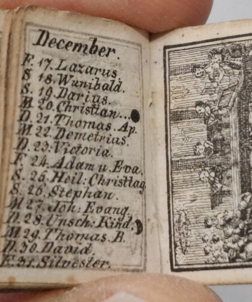 Net zo bijzonder is een almanak uit 1824 die slechts 2 à 3 gram weegt en maar 2,5 × 1,9 × 0,5 cm groot is. Dit minuscule boekje, uitgegeven in München door Clemens Senefelder, zit ondanks zijn formaat vol informatie. Het bevat alle dagen van het schrikkeljaar, telkens met een bijbehorende (vaak heiligen)naam. Daarnaast staan er een overzicht van Europese vorsten met hun leeftijden in én twee pagina’s genealogie van de Beierse “König Max”.