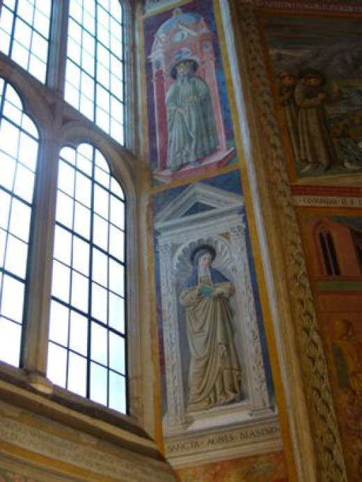 De heilige in de tekening doet denken aan de twee vrouwelijke figuren (de heiligen Clara en Agnes) die, staand in nissen, In Gozzoli’s frescocyclus in de San Francesco-kerk in Montefalco (muur aan de oostzijde, lager gedeelte van de afgeschuinde dagkanten van het venster, links en rechts) zijn afgebeeld (afb.).