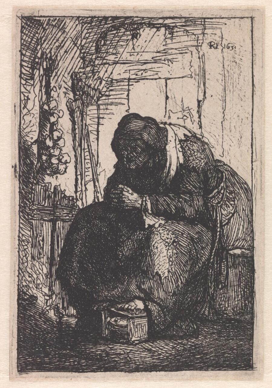 | Titel | Oude vrouw, zittend in een hut, met een streng uien aan de wand |