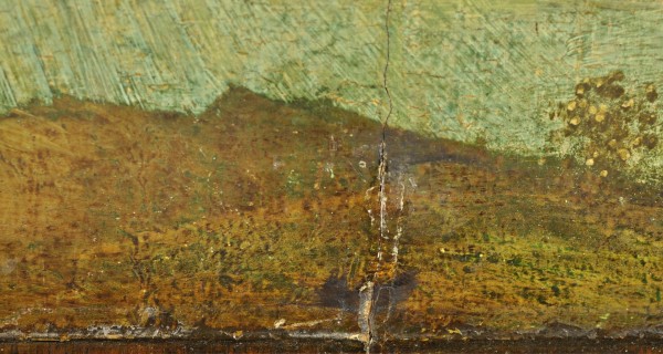 A preliminary examination has shown that the painting needs to be restored: the parquet (the reinforcing cradle at the back of the panel) is fixed whereas it should be free to ‘breathe’, the wood is rotten in places, the varnish has yellowed and some of the paint is loose. Here you see a close-up of a crack in the paint.
