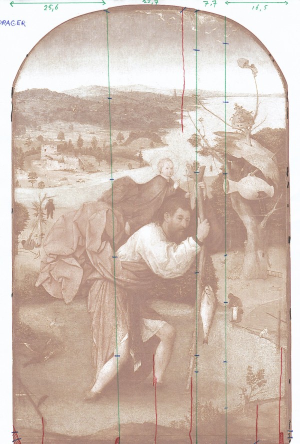 The four sections of the parquet and some cracks are indicated with pen: Hieronymus Bosch, Saint Christopher, 1490-1505, oil on panel, loan: Stichting Museum Boijmans Van Beuningen 1940